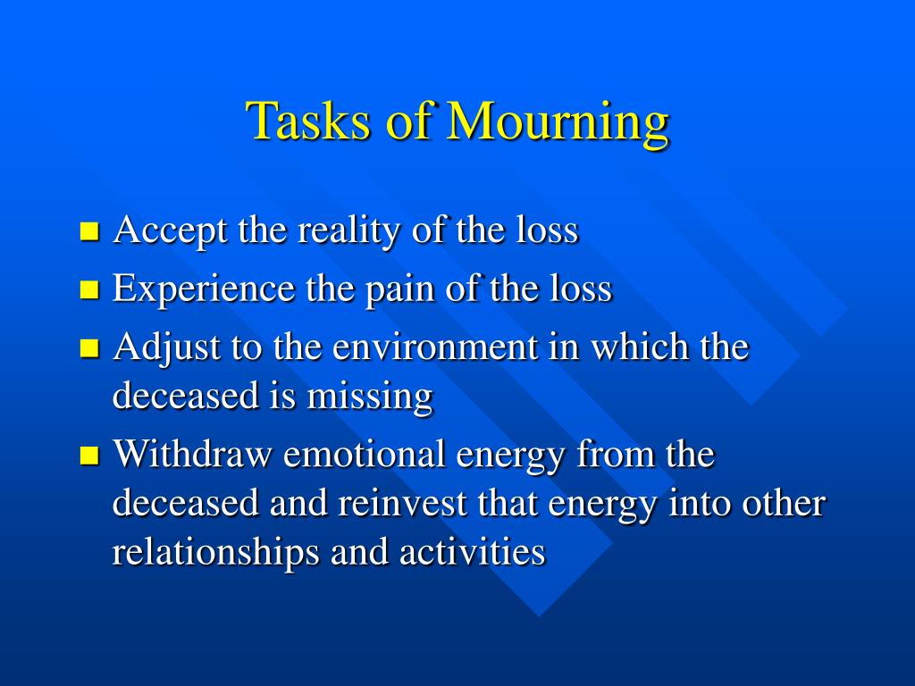 Tasks of Mourning • Accept the reality of the loss • Experience the pain of the loss • Adjust to the environment in which the deceased is missing • Withdraw emotional energy from the deceased and reinvest that energy into other relationships and activities