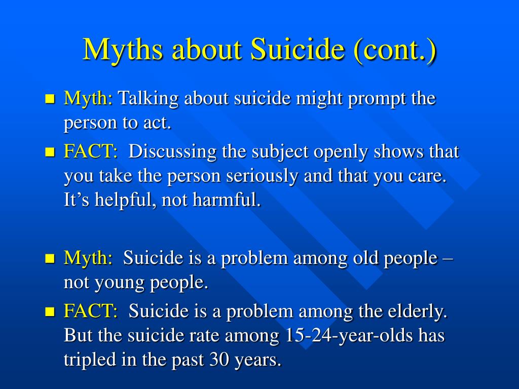 Myths about Suicide (cont.) • Myth: Talking about suicide might prompt the person to act. • FACT: Discussing the subject openly shows that you take the person seriously and that you care. It’s helpful, not harmful. • Myth: Suicide is a problem among old people – not young people. • FACT: Suicide is a problem among the elderly. But the suicide rate among 15-24-year-olds has tripled in the past 30 years.