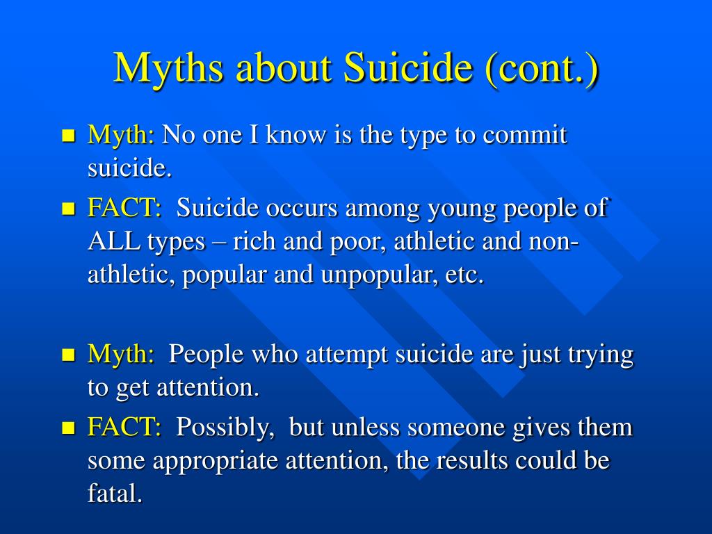 Myths about Suicide (cont.) • Myth: No one I know is the type to commit suicide. • FACT: Suicide occurs among young people of ALL types – rich and poor, athletic and non-athletic, popular and unpopular, etc. • Myth: People who attempt suicide are just trying to get attention. • FACT: Possibly, but unless someone gives them some appropriate attention, the results could be fatal.