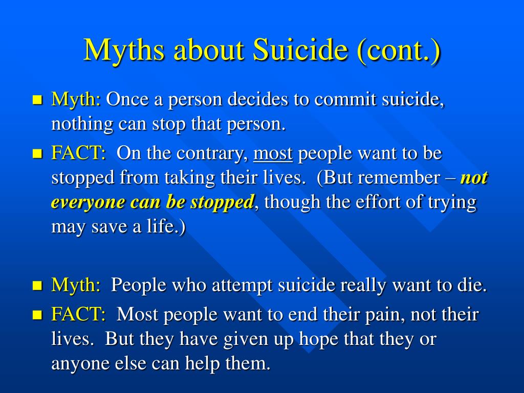 Myths about Suicide (cont.) • Myth: Once a person decides to commit suicide, nothing can stop that person. • FACT: On the contrary, most people want to be stopped from taking their lives. (But remember – not everyone can be stopped, though the effort of trying may save a life.) • Myth: People who attempt suicide really want to die. • FACT: Most people want to end their pain, not their lives. But they have given up hope that they or anyone else can help them.