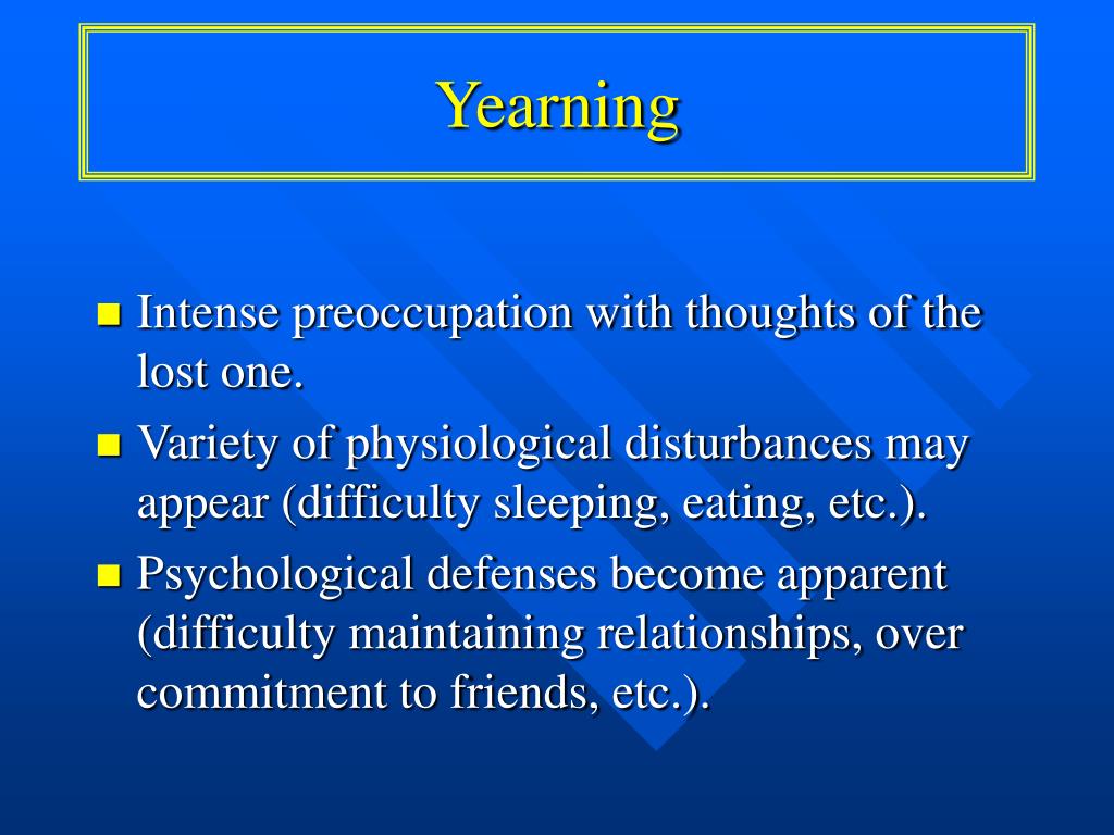 Yearning • Intense preoccupation with thoughts of the lost one. • Variety of physiological disturbances may appear (difficulty sleeping, eating, etc.). • Psychological defenses become apparent (difficulty maintaining relationships, over commitment to friends, etc.).