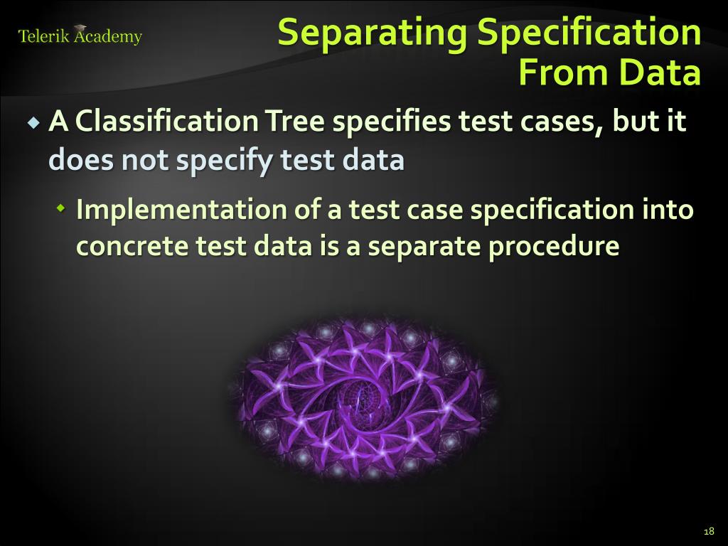 Separating Specification From Data • A Classification Tree specifies test cases, but it does not specify test data • Implementation of a test case specification into concrete test data is a separate procedure