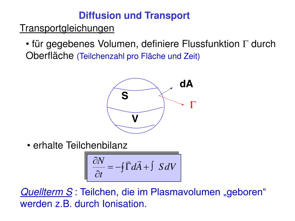 Diffusion und Transport • Transportgleichungen • für gegebenes Volumen, definiere Flussfunktion G durch Oberfläche (Teilchenzahl pro Fläche und Zeit) • erhalte Teilchenbilanz Quellterm S : Teilchen, die im Plasmavolumen „geboren“ werden z.B. durch Ionisation.