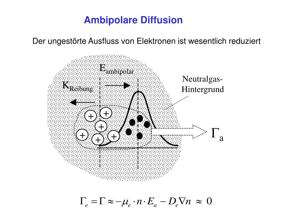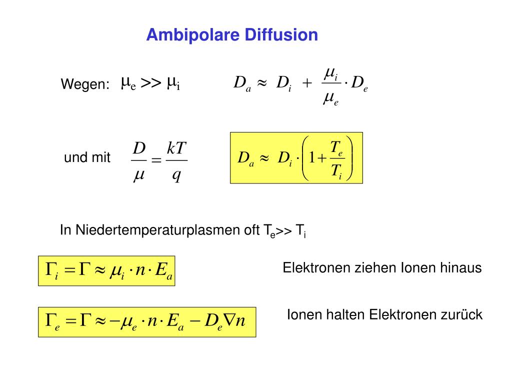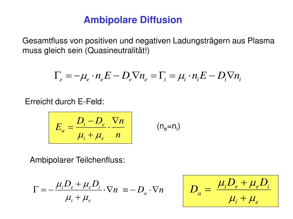 Ambipolare Diffusion Gesamtfluss von positiven und negativen Ladungsträgern aus Plasma muss gleich sein (Quasineutralität!) Erreicht durch E-Feld: (ne=ni) Ambipolarer Teilchenfluss: