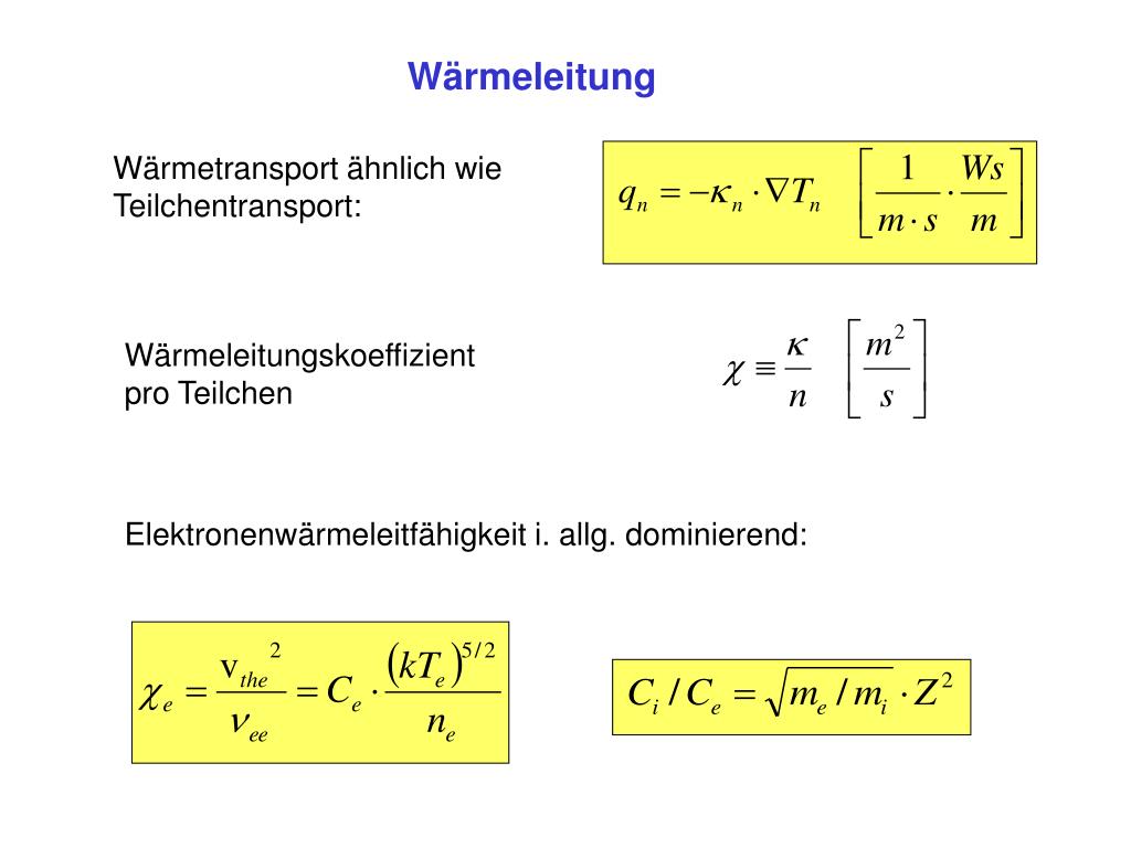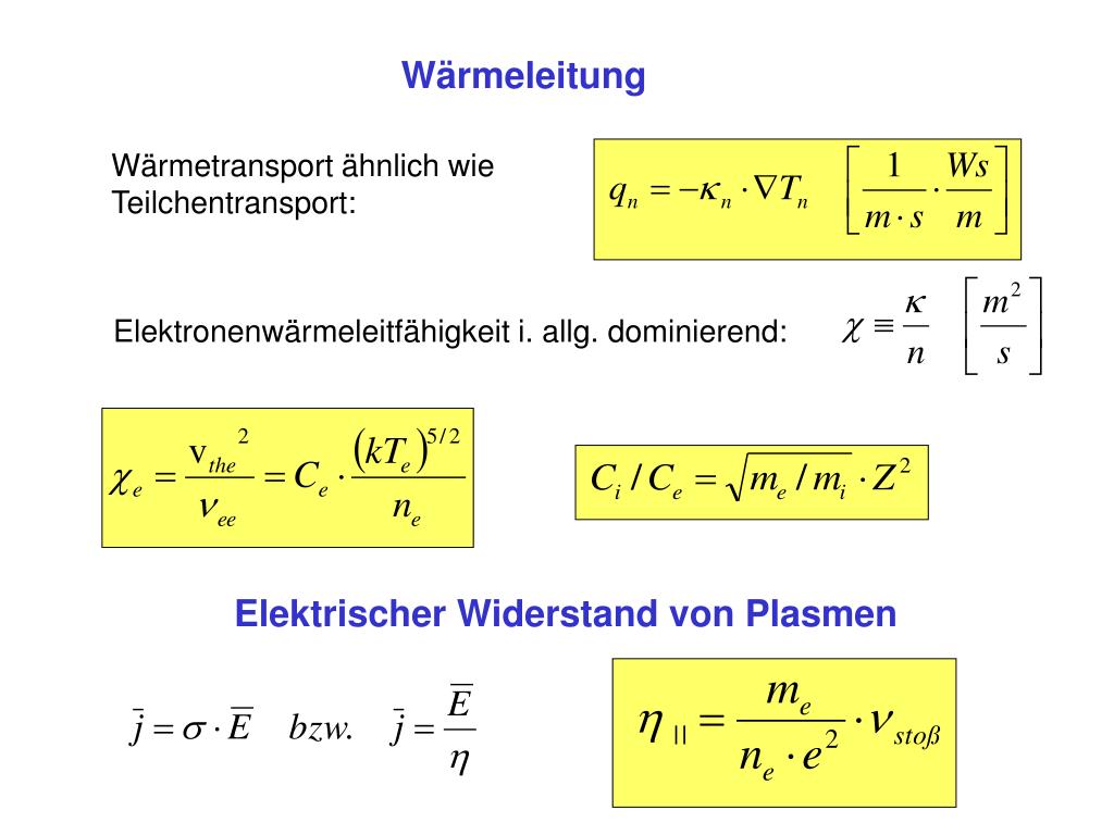 Wärmeleitung Wärmetransport ähnlich wie Teilchentransport: Elektronenwärmeleitfähigkeit i. allg. dominierend: Elektrischer Widerstand von Plasmen