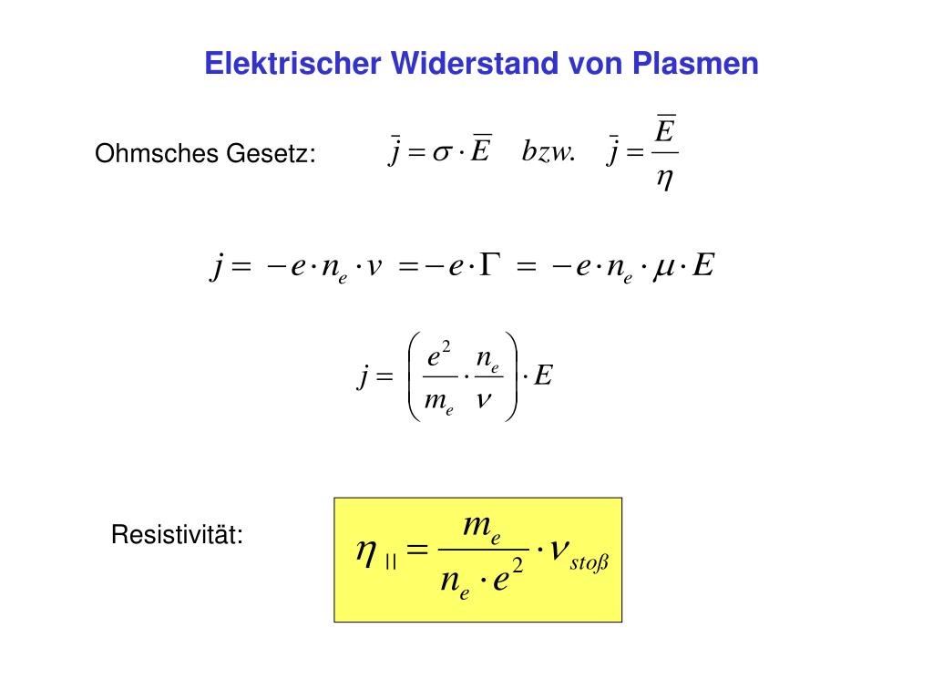Elektrischer Widerstand von Plasmen Ohmsches Gesetz: Resistivität:
