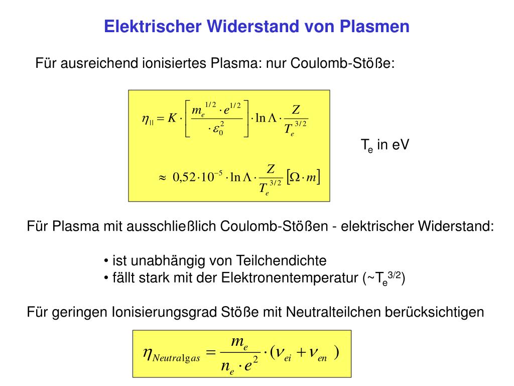 Elektrischer Widerstand von Plasmen Für ausreichend ionisiertes Plasma: nur Coulomb-Stöße: Te in eV • Für Plasma mit ausschließlich Coulomb-Stößen - elektrischer Widerstand: • ist unabhängig von Teilchendichte • fällt stark mit der Elektronentemperatur (~Te3/2) Für geringen Ionisierungsgrad Stöße mit Neutralteilchen berücksichtigen
