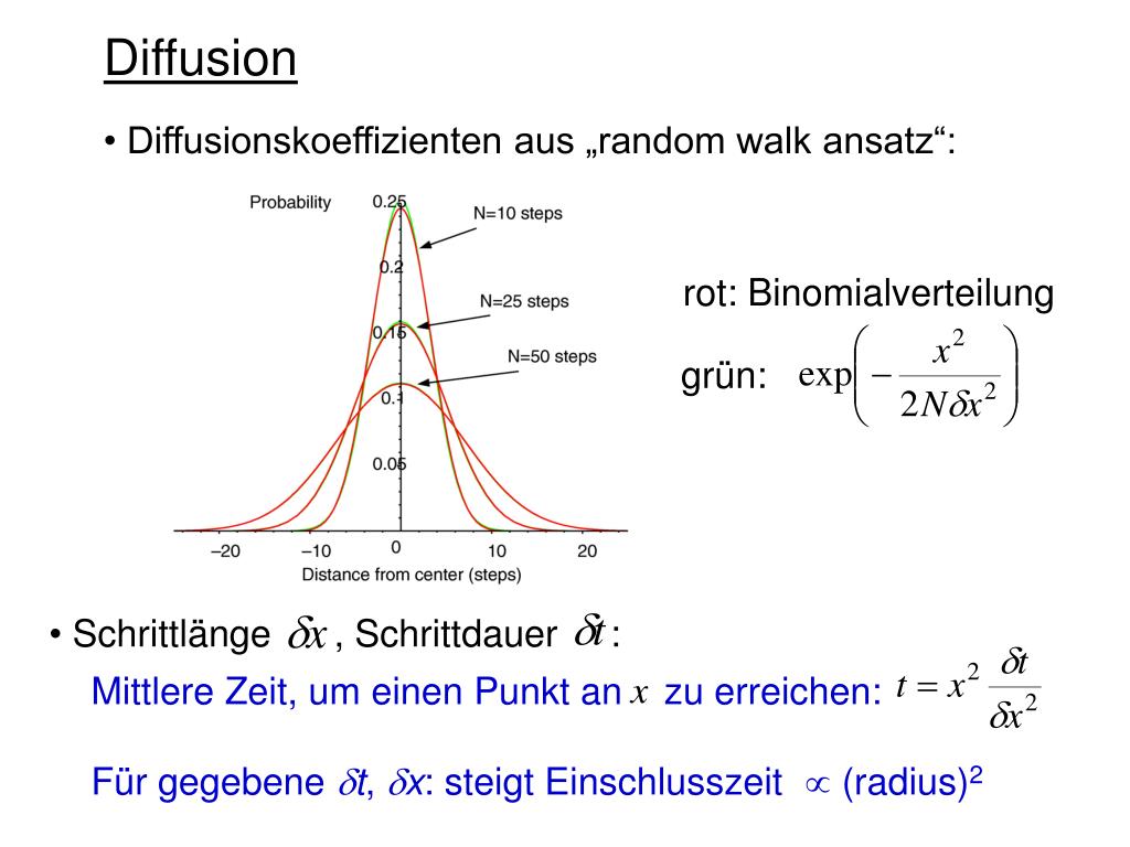 rot: Binomialverteilung grün: • Diffusion • Diffusionskoeffizienten aus „random walk ansatz“: • Schrittlänge , Schrittdauer : Mittlere Zeit, um einen Punkt an zu erreichen: Für gegebene dt, dx: steigt Einschlusszeit (radius)2