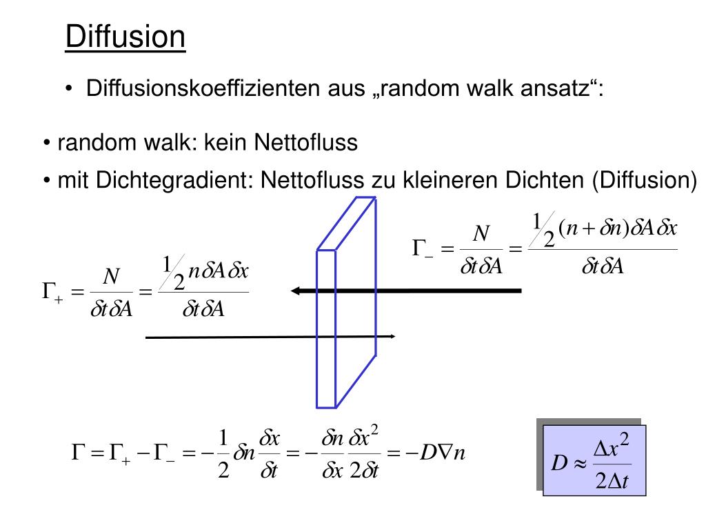 Diffusion • Diffusionskoeffizienten aus „random walk ansatz“: • random walk: kein Nettofluss • mit Dichtegradient: Nettofluss zu kleineren Dichten (Diffusion)