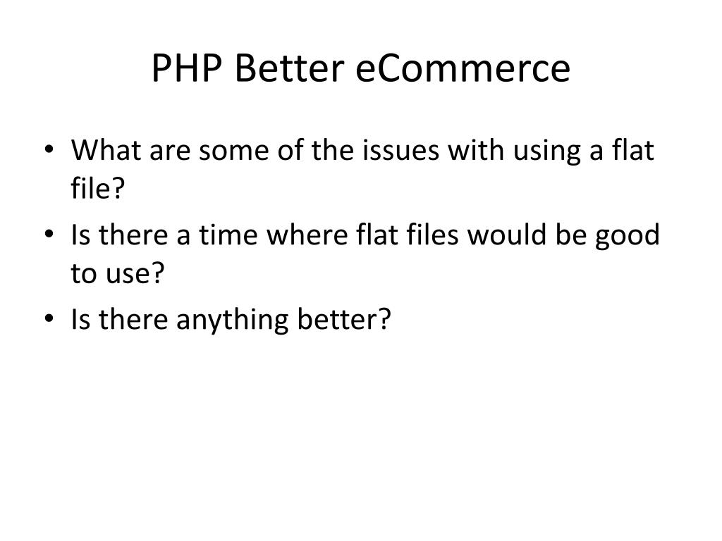 PHP Better eCommerce • What are some of the issues with using a flat file? • Is there a time where flat files would be good to use? • Is there anything better?