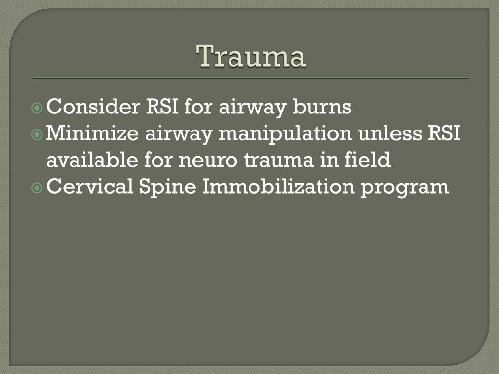 Trauma Consider RSI for airway burns Minimize airway manipulation unless RSI available for neuro trauma in field Cervical Spine Immobilization program