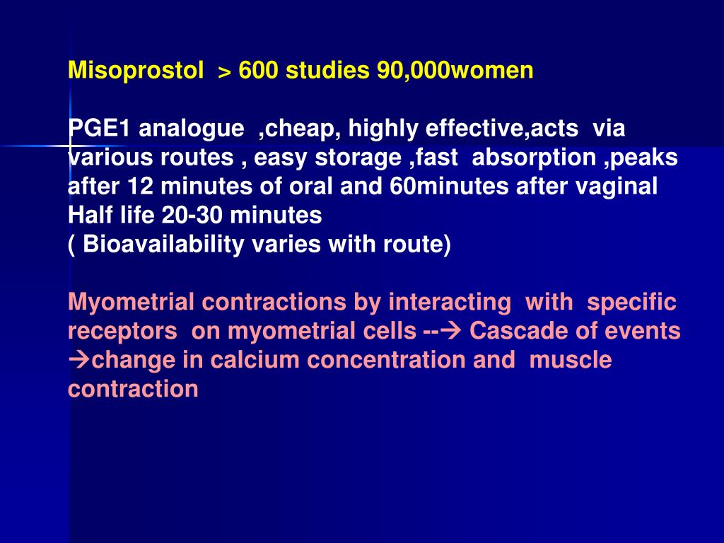 Misoprostol > 600 studies 90,000women PGE1 analogue ,cheap, highly effective,acts via various routes , easy storage ,fast absorption ,peaks after 12 minutes of oral and 60minutes after vaginal Half life 20-30 minutes ( Bioavailability varies with route) Myometrial contractions by interacting with specific receptors on myometrial cells -- Cascade of events change in calcium concentration and muscle contraction