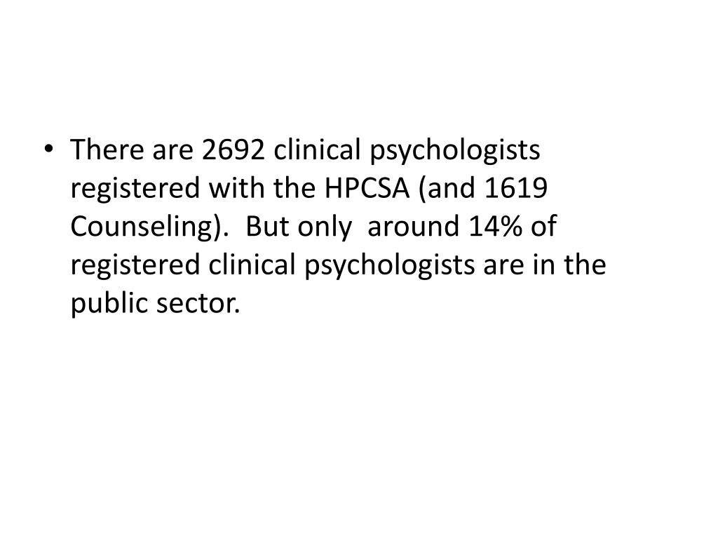 There are 2692 clinical psychologists registered with the HPCSA (and 1619 Counseling). But only around 14% of registered clinical psychologists are in the public sector.
