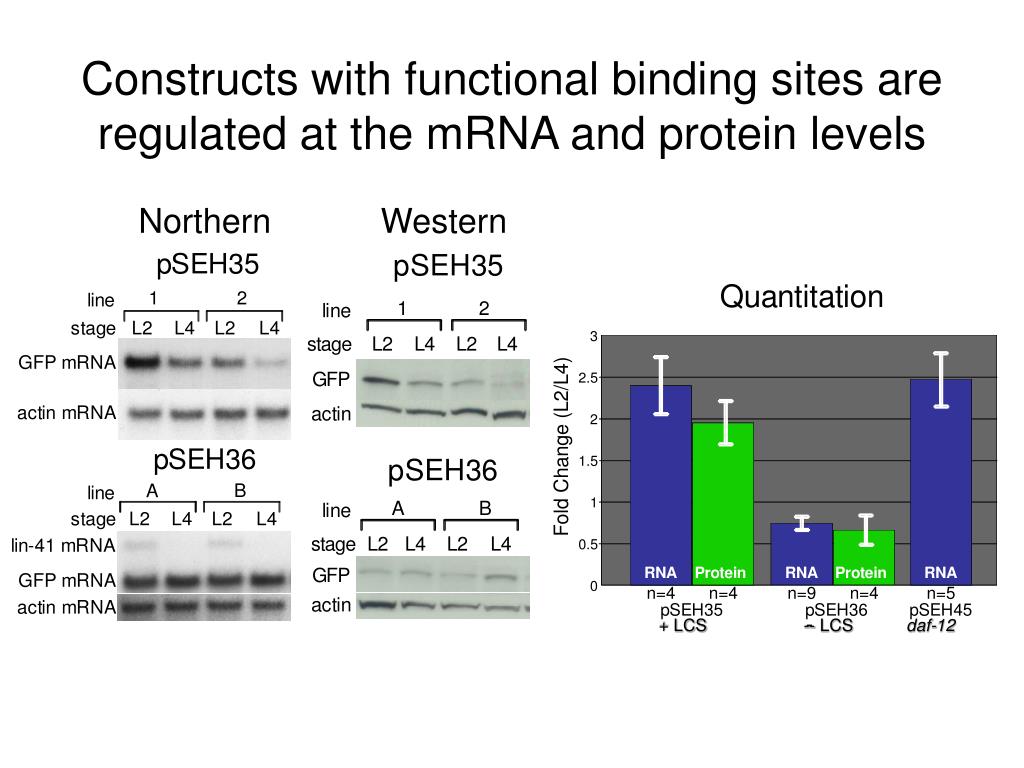 Constructs with functional binding sites are regulated at the mRNA and protein levels Northern Western + LCS -- LCS daf-12