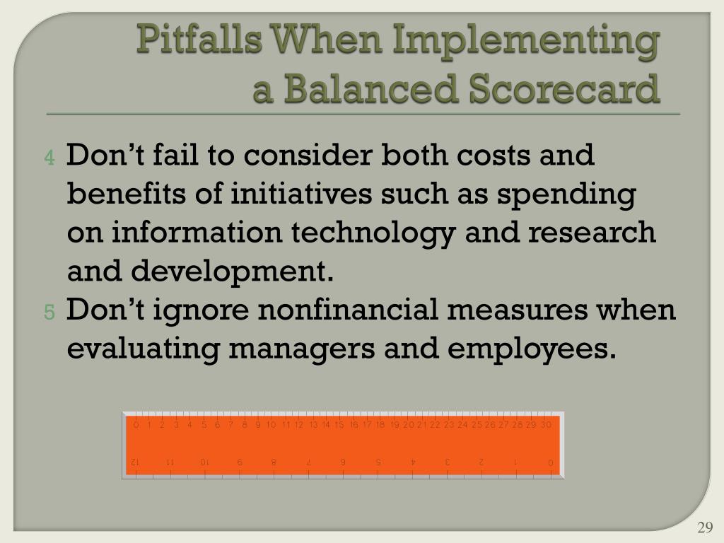 Pitfalls When Implementing a Balanced Scorecard • Don’t fail to consider both costs and benefits of initiatives such as spending on information technology and research and development. • Don’t ignore nonfinancial measures when evaluating managers and employees.