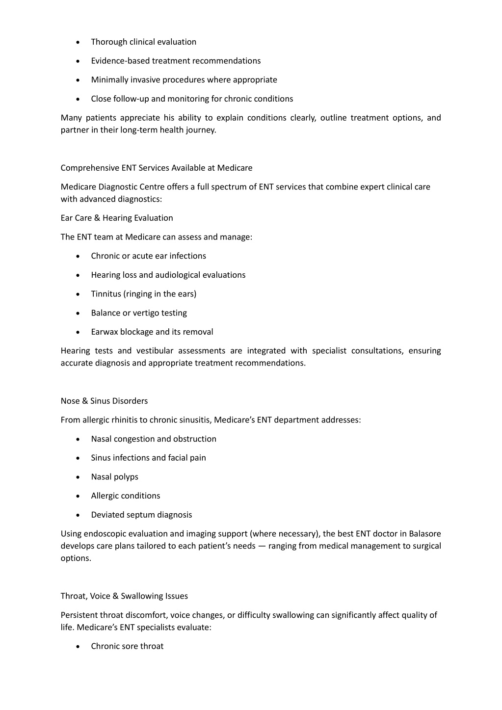 • Thorough clinical evaluation • Evidence-based treatment recommendations • Minimally invasive procedures where appropriate • Close follow-up and monitoring for chronic conditions Many patients appreciate his ability to explain conditions clearly, outline treatment options, and partner in their long-term health journey. Comprehensive ENT Services Available at Medicare Medicare Diagnostic Centre offers a full spectrum of ENT services that combine expert clinical care with advanced diagnostics: Ear Care & Hearing Evaluation The ENT team at Medicare can assess and manage: • Chronic or acute ear infections • Hearing loss and audiological evaluations • Tinnitus (ringing in the ears) • Balance or vertigo testing • Earwax blockage and its removal Hearing tests and vestibular assessments are integrated with specialist consultations, ensuring accurate diagnosis and appropriate treatment recommendations. Nose & Sinus Disorders From allergic rhinitis to chronic sinusitis, Medicare’s ENT department addresses: • Nasal congestion and obstruction • Sinus infections and facial pain • Nasal polyps • Allergic conditions • Deviated septum diagnosis Using endoscopic evaluation and imaging support (where necessary), the best ENT doctor in Balasore develops care plans tailored to each patient’s needs — ranging from medical management to surgical options. Throat, Voice & Swallowing Issues Persistent throat discomfort, voice changes, or difficulty swallowing can significantly affect quality of life. Medicare’s ENT specialists evaluate: • Chronic sore throat