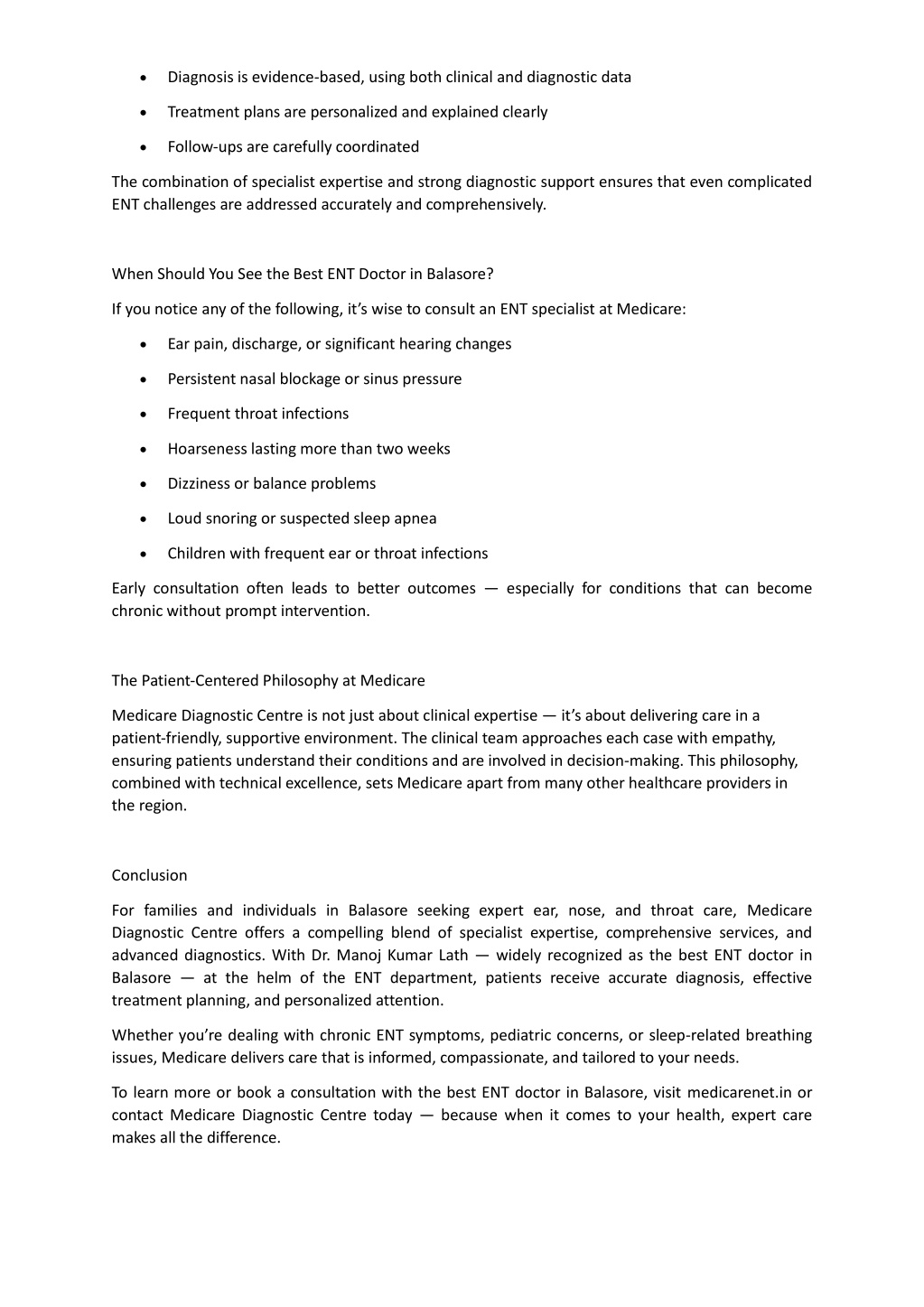 • Diagnosis is evidence-based, using both clinical and diagnostic data • Treatment plans are personalized and explained clearly • Follow-ups are carefully coordinated The combination of specialist expertise and strong diagnostic support ensures that even complicated ENT challenges are addressed accurately and comprehensively. When Should You See the Best ENT Doctor in Balasore? If you notice any of the following, it’s wise to consult an ENT specialist at Medicare: • Ear pain, discharge, or significant hearing changes • Persistent nasal blockage or sinus pressure • Frequent throat infections • Hoarseness lasting more than two weeks • Dizziness or balance problems • Loud snoring or suspected sleep apnea • Children with frequent ear or throat infections Early consultation often leads to better outcomes — especially for conditions that can become chronic without prompt intervention. The Patient-Centered Philosophy at Medicare Medicare Diagnostic Centre is not just about clinical expertise —it’s about delivering care in a patient-friendly, supportive environment. The clinical team approaches each case with empathy, ensuring patients understand their conditions and are involved in decision-making. This philosophy, combined with technical excellence, sets Medicare apart from many other healthcare providers in the region. Conclusion For families and individuals in Balasore seeking expert ear, nose, and throat care, Medicare Diagnostic Centre offers a compelling blend of specialist expertise, comprehensive services, and advanced diagnostics. With Dr. Manoj Kumar Lath — widely recognized as the best ENT doctor in Balasore — at the helm of the ENT department, patients receive accurate diagnosis, effective treatment planning, and personalized attention. Whether you’re dealing with chronic ENT symptoms, pediatric concerns, or sleep-related breathing issues, Medicare delivers care that is informed, compassionate, and tailored to your needs. To learn more or book a consultation with the best ENT doctor in Balasore, visit medicarenet.in or contact Medicare Diagnostic Centre today — because when it comes to your health, expert care makes all the difference.
