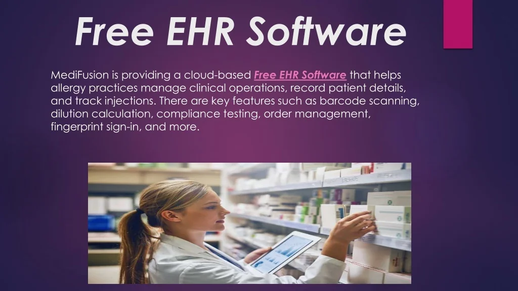 Free EHR Software MediFusion is providing a cloud-based Free EHR Software that helps allergy practices manage clinical operations, record patient details, and track injections. There are key features such as barcode scanning, dilution calculation, compliance testing, order management, fingerprint sign-in, and more.