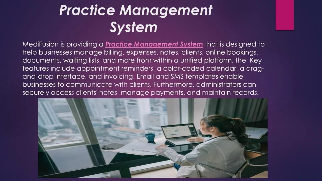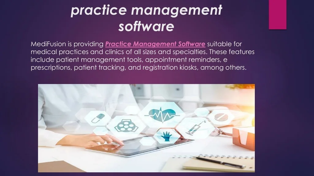 practice management software MediFusion is providing Practice Management Software suitable for medical practices and clinics of all sizes and specialties. These features include patient management tools, appointment reminders, e prescriptions, patient tracking, and registration kiosks, among others.