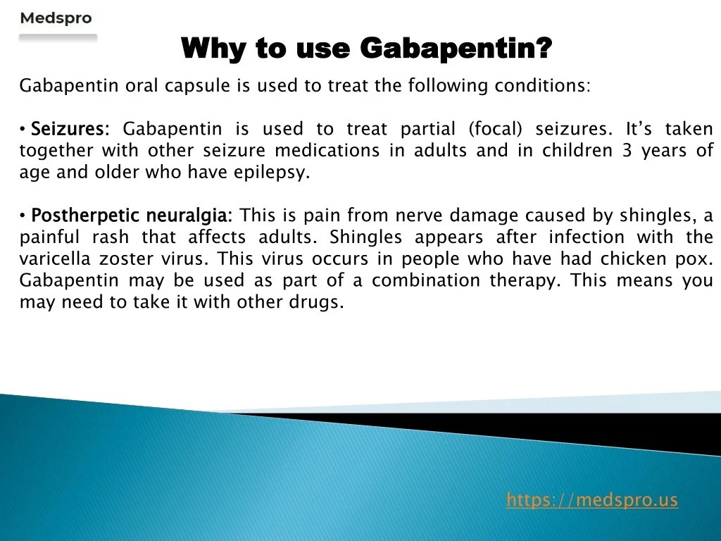 Why to use Gabapentin? • Gabapentin oral capsule is used to treat the following conditions: • Seizures: Gabapentin is used to treat partial (focal) seizures. It’s taken together with other seizure medications in adults and in children 3 years of age and older who have epilepsy. • Postherpetic neuralgia: This is pain from nerve damage caused by shingles, a painful rash that affects adults. Shingles appears after infection with the varicella zoster virus. This virus occurs in people who have had chicken pox. Gabapentin may be used as part of a combination therapy. This means you may need to take it with other drugs. https://medspro.us