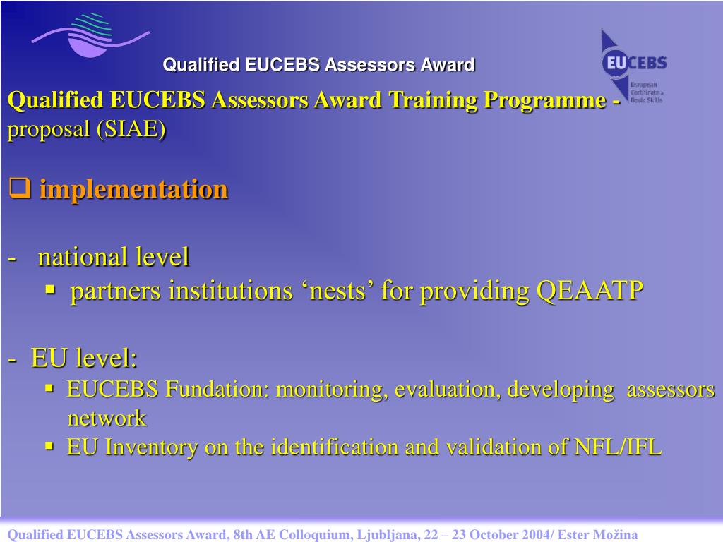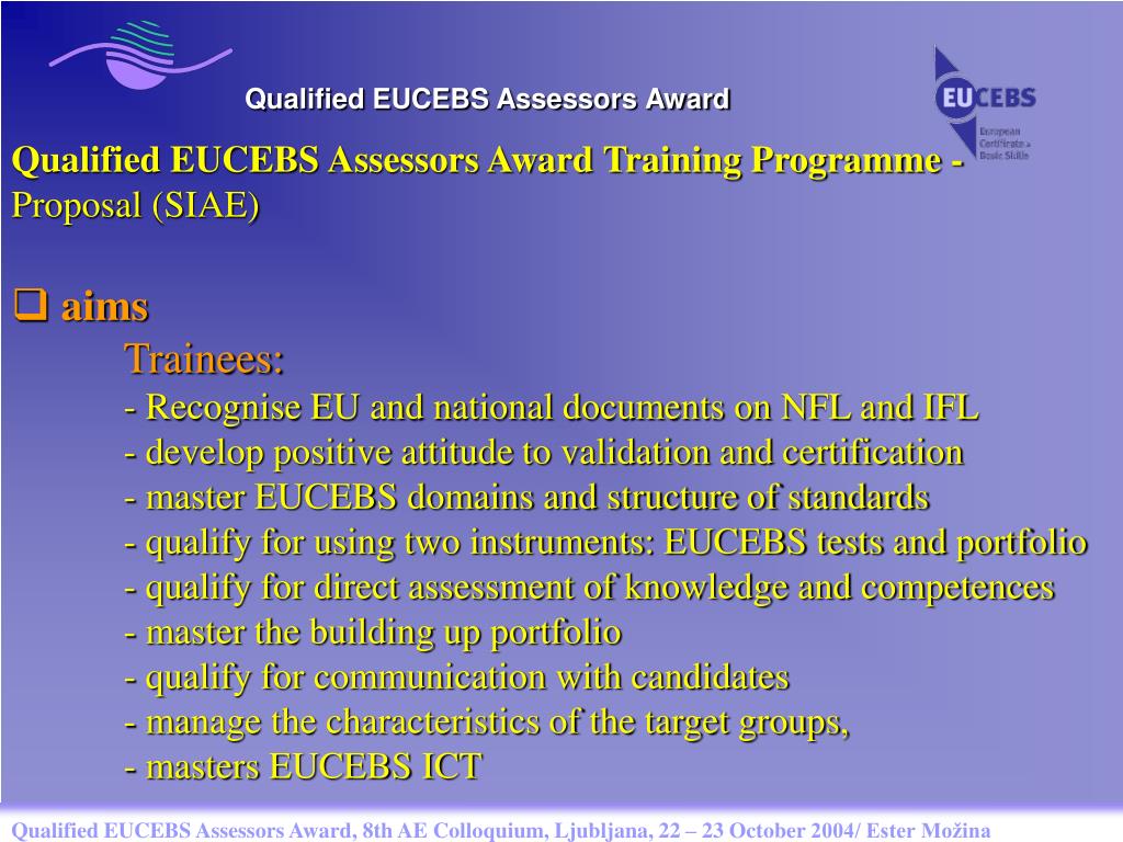 Qualified EUCEBS Assessors Award • Qualified EUCEBS Assessors Award Training Programme - • Proposal (SIAE) • aims Trainees: • Recognise EU and national documents on NFL and IFL • develop positive attitude to validation and certification • master EUCEBS domains and structure of standards • qualify for using two instruments: EUCEBS tests and portfolio • qualify for direct assessment of knowledge and competences • master the building up portfolio • qualify for communication with candidates • manage the characteristics of the target groups, • masters EUCEBS ICT