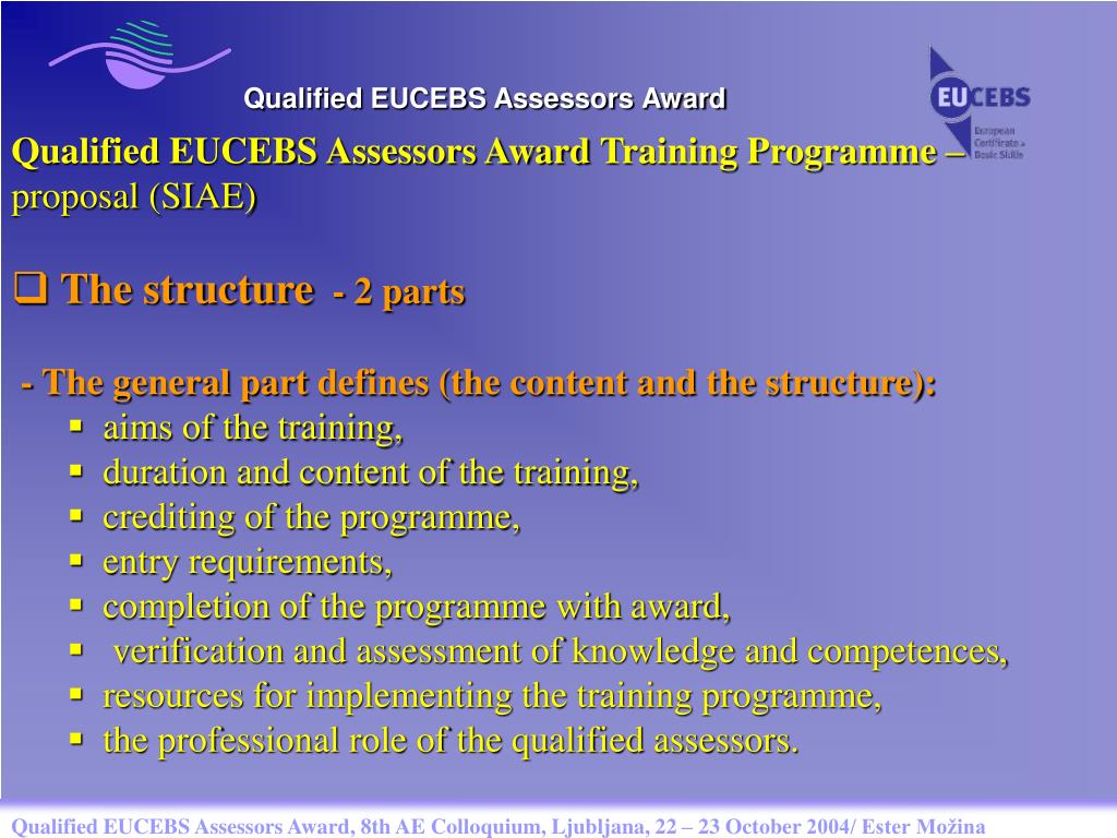 Qualified EUCEBS Assessors Award • Qualified EUCEBS Assessors Award Training Programme – • proposal (SIAE) • The structure- 2 parts - The general part defines (the content and the structure): • aims of the training, • duration and content of the training, • crediting of the programme, • entry requirements, • completion of the programme with award, • verification and assessment of knowledge and competences, • resources for implementing the training programme, • the professional role of the qualified assessors.