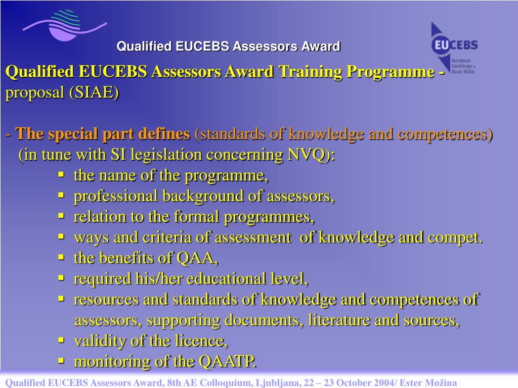 Qualified EUCEBS Assessors Award • Qualified EUCEBS Assessors Award Training Programme - • proposal (SIAE) • The special part defines (standards of knowledge and competences) • (in tune with SI legislation concerning NVQ): • the name of the programme, • professional background of assessors, • relation to the formal programmes, • ways and criteria of assessment of knowledge and compet. • the benefits of QAA, • required his/her educational level, • resources and standards of knowledge and competences of assessors, supporting documents, literature and sources, • validity of the licence, • monitoring of the QAATP.