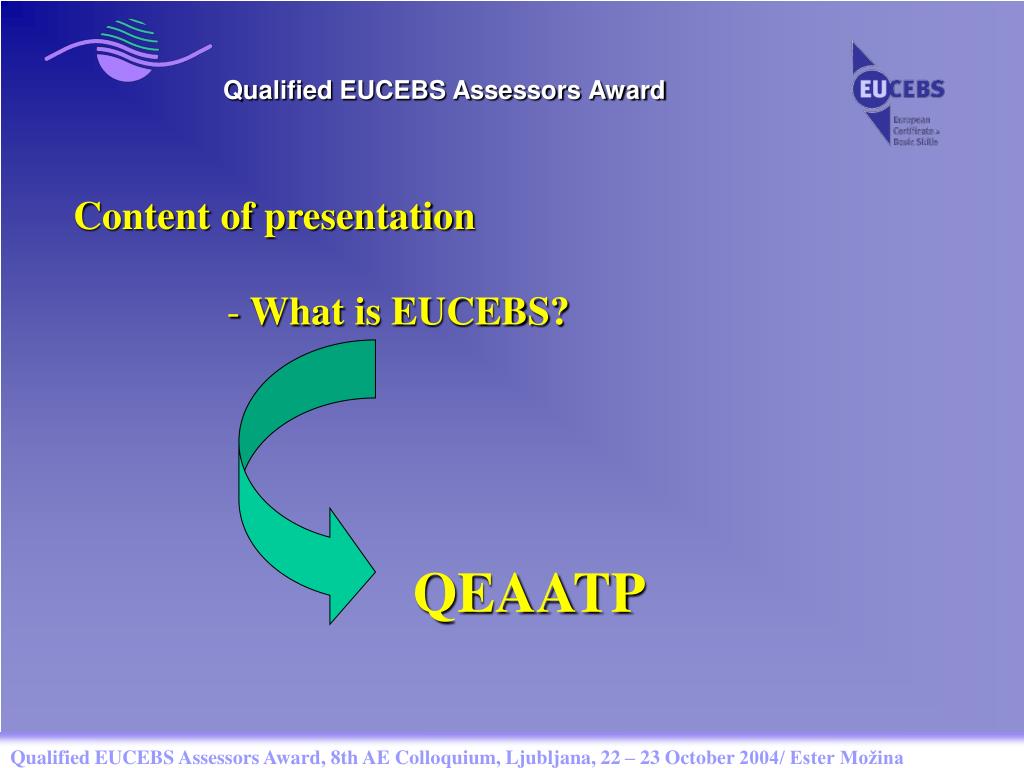Qualified EUCEBS Assessors Award • Content of presentation • What is EUCEBS? QEAATP