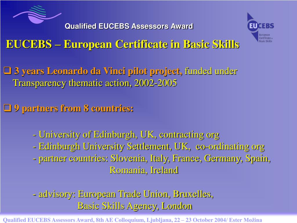 Qualified EUCEBS Assessors Award • EUCEBS – European Certificate in Basic Skills • 3 years Leonardo da Vinci pilot project,funded under Transparency thematic action, 2002-2005 • 9 partners from 8 countries: • University of Edinburgh, UK, contracting org • Edinburgh University Settlement, UK, co-ordinating org • partner countries: Slovenia, Italy, France, Germany, Spain, • Romania, Ireland • advisory: European Trade Union, Bruxelles, • Basic Skills Agency, London