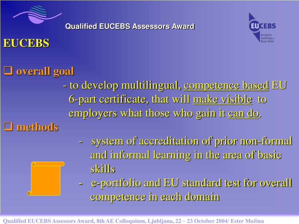 Qualified EUCEBS Assessors Award • Qualified EUCEBS Assessors Award Training Programme - • proposal (SIAE) • added value • training fornew professional and occupational roles • (new professional field) • a pathway to EU market of basic skills and competences