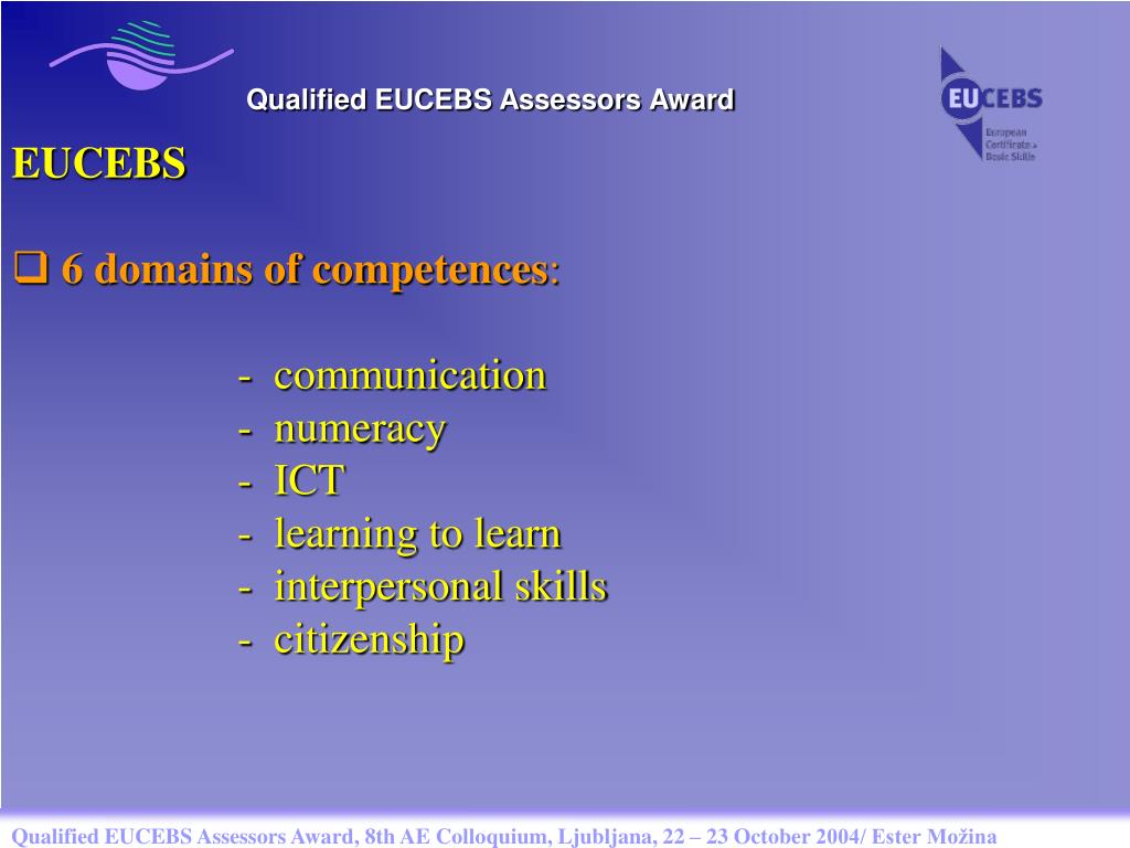 Qualified EUCEBS Assessors Award • EUCEBS • 6 domains of competences: • communication • numeracy • ICT • learning to learn • interpersonal skills • citizenship
