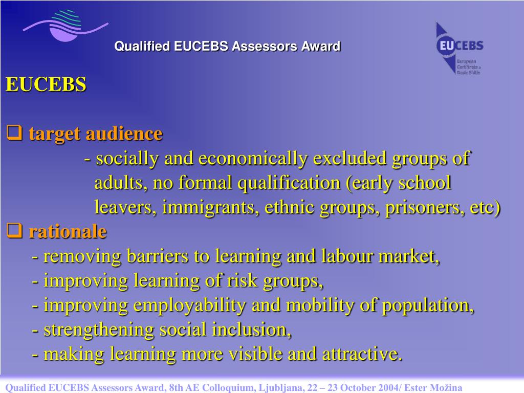 Qualified EUCEBS Assessors Award • EUCEBS • target audience • socially and economically excluded groups of • adults, no formal qualification (early school • leavers, immigrants, ethnic groups, prisoners, etc) • rationale • removing barriers to learning and labour market, • improving learning of risk groups, • improving employability and mobility of population, • strengthening social inclusion, • making learning more visible and attractive.