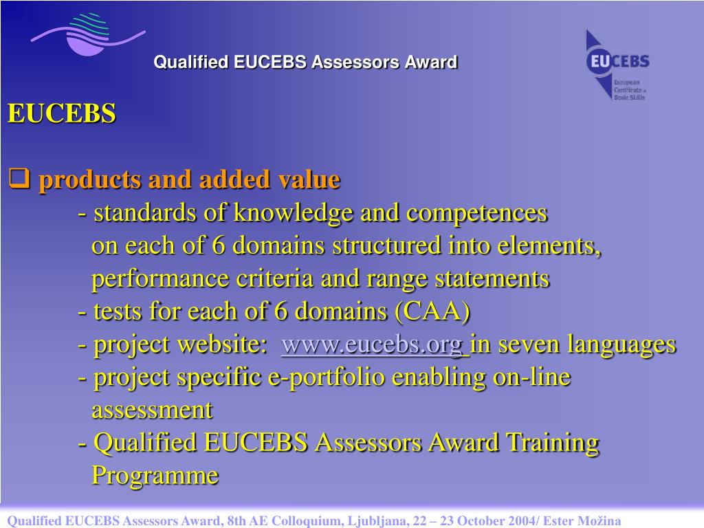 Qualified EUCEBS Assessors Award • EUCEBS • products and added value • standards of knowledge and competences • on each of 6 domains structured into elements, • performance criteria and range statements • tests for each of 6 domains (CAA) • project website: www.eucebs.orgin seven languages • project specific e-portfolio enabling on-line • assessment • Qualified EUCEBS Assessors Award Training • Programme