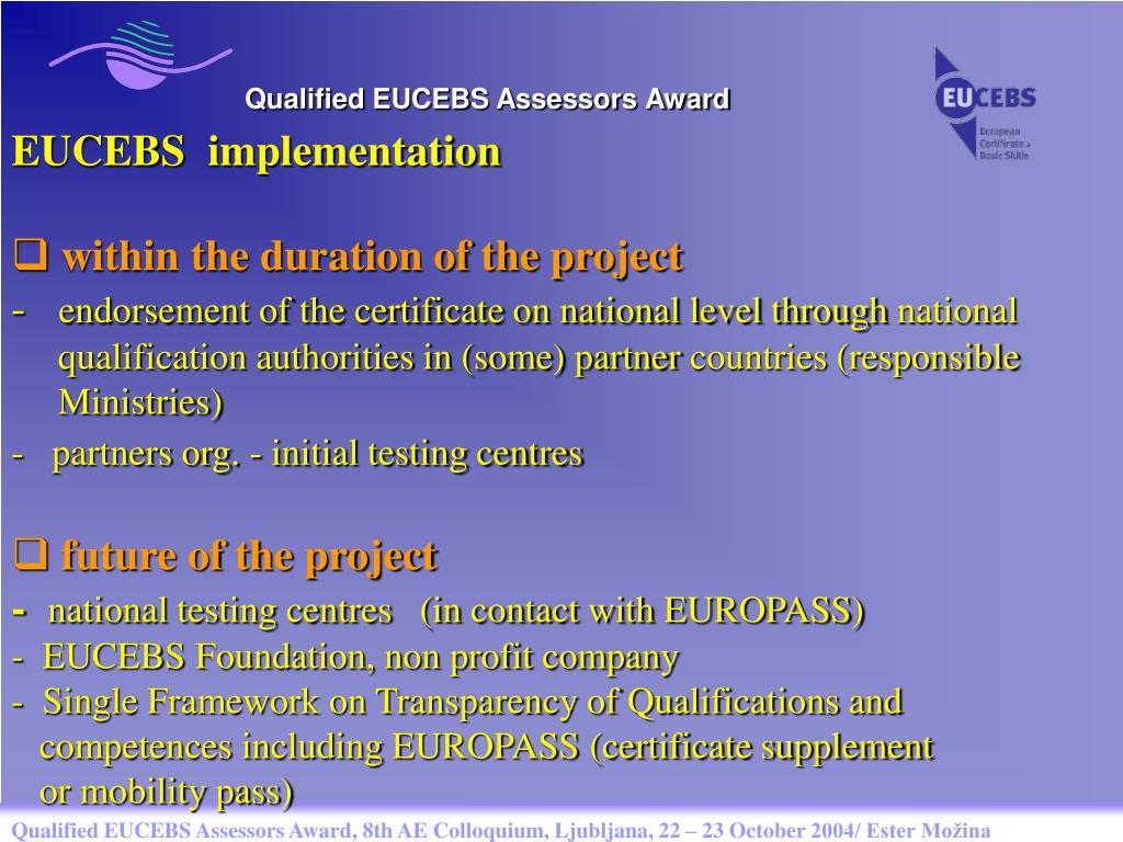Qualified EUCEBS Assessors Award • EUCEBSimplementation • within the duration of the project • endorsement of the certificate on national level throughnational • qualification authorities in (some) partnercountries (responsible • Ministries) • partners org. - initial testing centres • future of the project • - national testing centres (in contact with EUROPASS) • EUCEBS Foundation, non profit company • Single Framework on Transparency of Qualifications and • competences including EUROPASS (certificate supplement • or mobility pass)