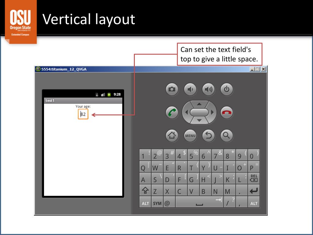Vertical layout var win = Ti.UI.createWindow({ title : 'Very basic app', backgroundColor : '#FFFFFF', layout: 'vertical' }); varlbl = Ti.UI.createLabel({ text : 'Your age:', color : '#000000', height: Ti.UI.SIZE // or you could use a hard-coded value (not a good idea) /* and you can use left: 0 to align left, or right: 0 to align right */ }); win.add(lbl); var txt = Ti.UI.createTextField({ value : '82', keyboardType : Titanium.UI.KEYBOARD_NUMBER_PAD, height: Ti.UI.SIZE // or Ti.UI.FILL would mean "take up whatever space is available" }); win.add(txt); win.open();