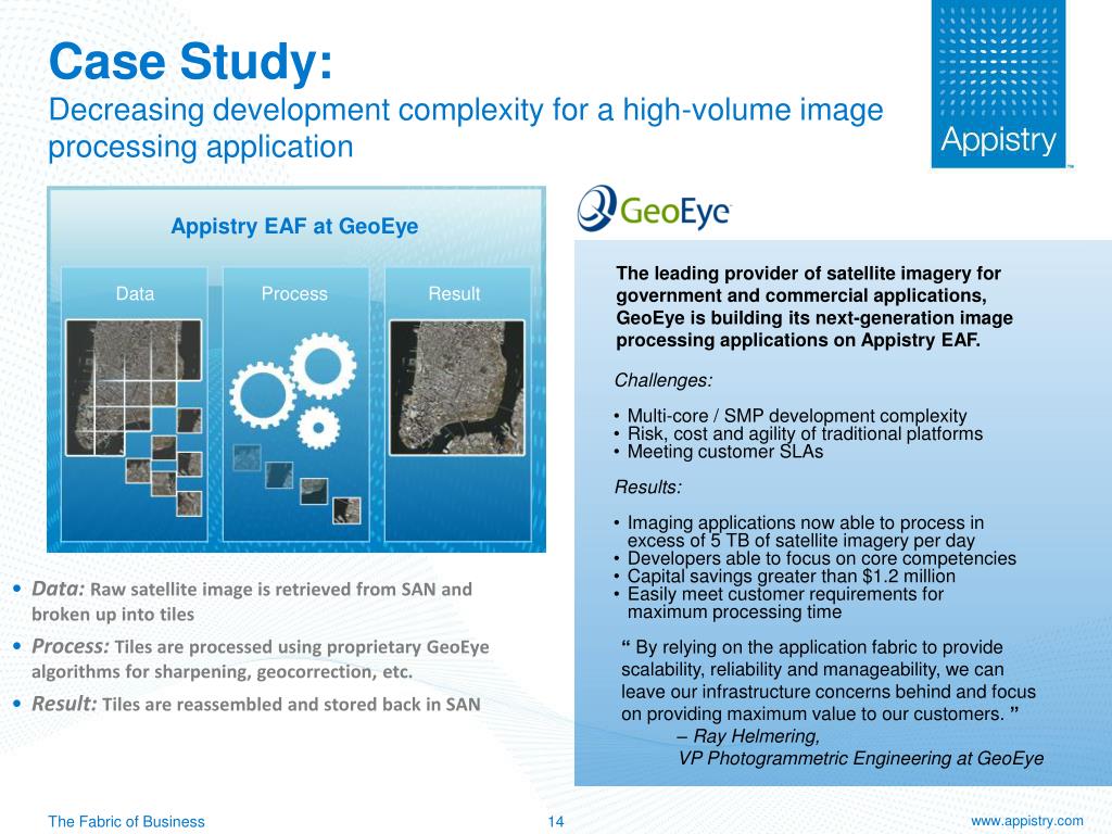 Case Study:Decreasing development complexity for a high-volume image processing application Appistry EAF at GeoEye The leading provider of satellite imagery for government and commercial applications, GeoEye is building its next-generation image processing applications on Appistry EAF. Data Process Result • Challenges: • Multi-core / SMP development complexity • Risk, cost and agility of traditional platforms • Meeting customer SLAs • Results: • Imaging applications now able to process in excess of 5 TB of satellite imagery per day • Developers able to focus on core competencies • Capital savings greater than $1.2 million • Easily meet customer requirements for maximum processing time “ By relying on the application fabric to provide scalability, reliability and manageability, we can leave our infrastructure concerns behind and focus on providing maximum value to our customers. ” – Ray Helmering,VP Photogrammetric Engineering at GeoEye Data: Raw satellite image is retrieved from SAN and broken up into tiles Process: Tiles are processed using proprietary GeoEye algorithms for sharpening, geocorrection, etc. Result: Tiles are reassembled and stored back in SAN