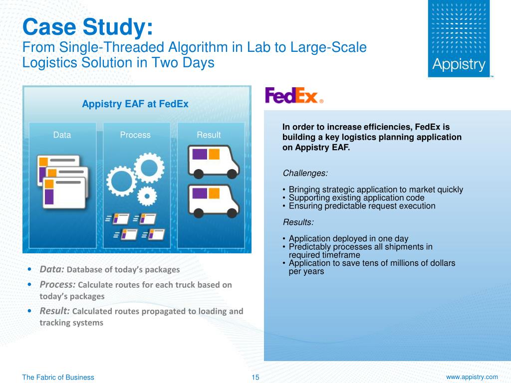Case Study:From Single-Threaded Algorithm in Lab to Large-Scale Logistics Solution in Two Days • Data: Database of today’s packages • Process: Calculate routes for each truck based on today’s packages • Result: Calculated routes propagated to loading and tracking systems Appistry EAF at FedEx In order to increase efficiencies, FedEx is building a key logistics planning application on Appistry EAF. Data Process Result • Challenges: • Bringing strategic application to market quickly • Supporting existing application code • Ensuring predictable request execution • Results: • Application deployed in one day • Predictably processes all shipments in required timeframe • Application to save tens of millions of dollars per years