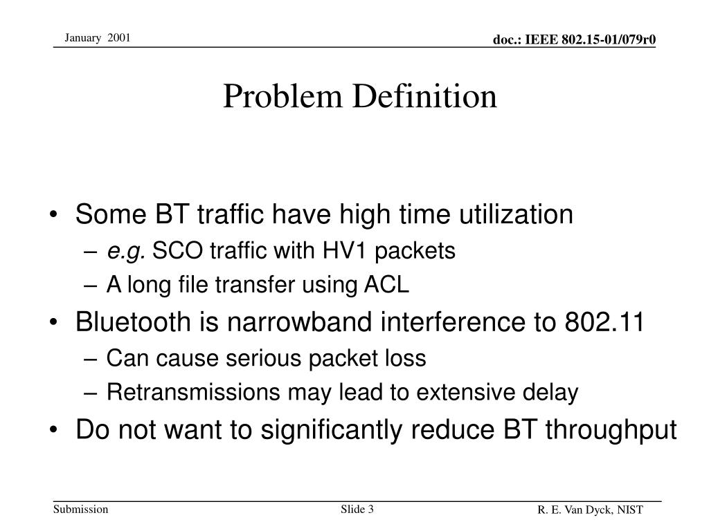 Problem Definition • Some BT traffic have high time utilization • e.g. SCO traffic with HV1 packets • A long file transfer using ACL • Bluetooth is narrowband interference to 802.11 • Can cause serious packet loss • Retransmissions may lead to extensive delay • Do not want to significantly reduce BT throughput