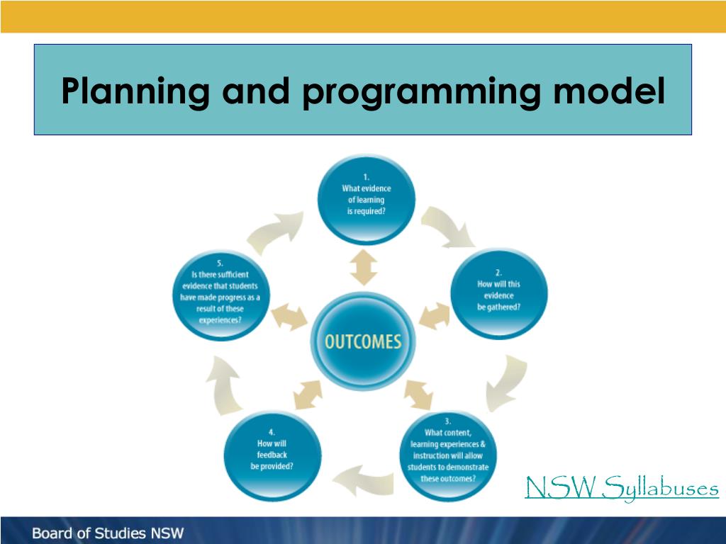 Planning and programming model • What evidence of learning is required? (pg 7) • writes short, simple sentences • uses accurate structure when writing simple sentences. • How will this evidence be gathered? (pg 9) • analysis of writing samples. • What content, learning experiences and instruction will allow students to demonstrate these outcomes? (pg 16) • procedures and strategies – sentence writing.