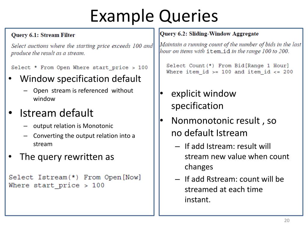 Example Queries • Unbounded windows are applied by default on both Open and Close • Default Istream is not applied • Subquery return a monotonic relation, but no window specification following the query. • The result of the entire query is not monotonic—auction tuples are deleted from the result when the auction is closed—and therefore an outermost Istream operator is not applied. • partitioned window on the Register stream obtains the latest registration for each user • Where clause filters out users who have already deregistered.