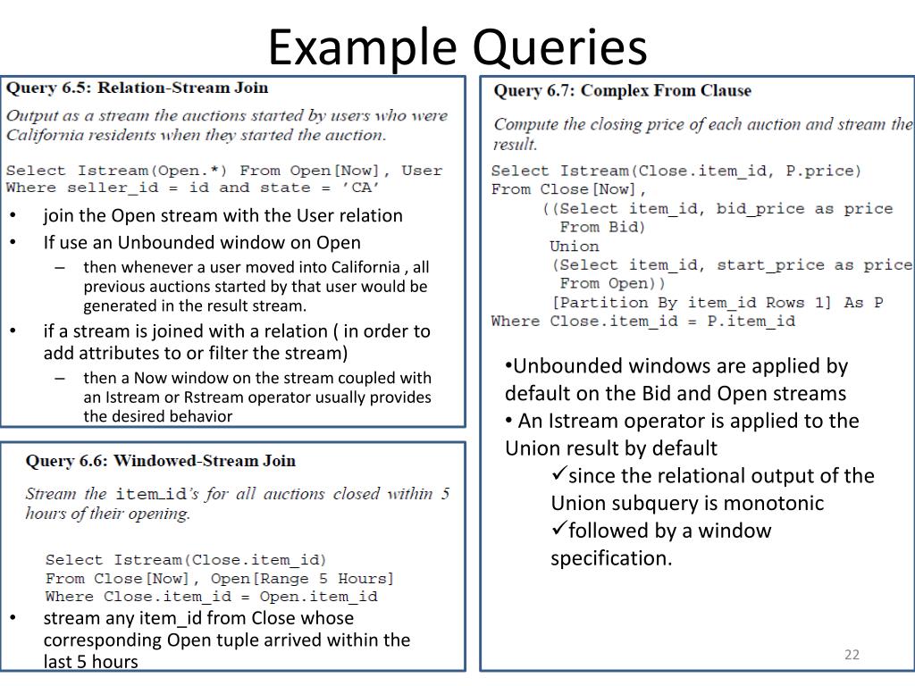 Example Queries • join the Open stream with the User relation • If use an Unbounded window on Open • then whenever a user moved into California , all previous auctions started by that user would be generated in the result stream. • if a stream is joined with a relation ( in order to add attributes to or filter the stream) • then a Now window on the stream coupled with an Istream or Rstream operator usually provides the desired behavior • stream any item_id from Close whose corresponding Open tuple arrived within the last 5 hours • Unbounded windows are applied by default on the Bid and Open streams • An Istream operator is applied to the Union result by default • since the relational output of the Union subquery is monotonic • followed by a window specification.