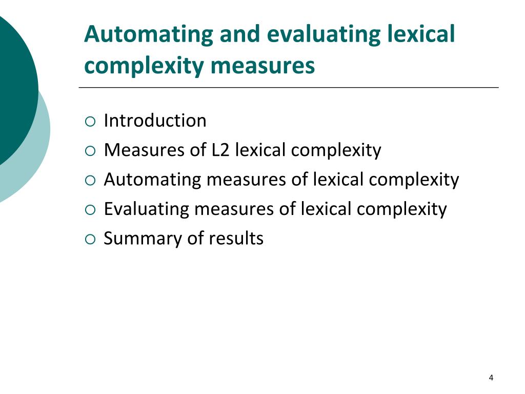 Automating and evaluating lexical complexity measures Introduction Measures of L2 lexical complexity Automating measures of lexical complexity Evaluating measures of lexical complexity Summary of results 4