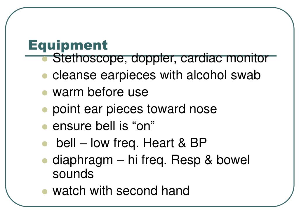 Equipment • Stethoscope, doppler, cardiac monitor • cleanse earpieces with alcohol swab • warm before use • point ear pieces toward nose • ensure bell is “on” • bell – low freq. Heart & BP • diaphragm – hi freq. Resp & bowel sounds • watch with second hand