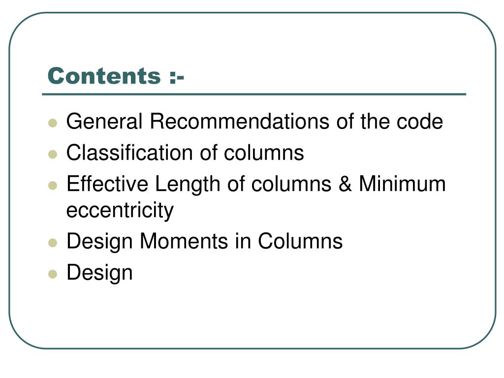 Contents :- • General Recommendations of the code • Classification of columns • Effective Length of columns & Minimum eccentricity • Design Moments in Columns • Design