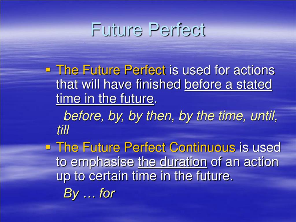 Future Perfect • The Future Perfect is used for actions that will have finished before a stated time in the future. before, by, by then, by the time, until, till • The Future Perfect Continuous is used to emphasise the duration of an action up to certain time in the future. By … for