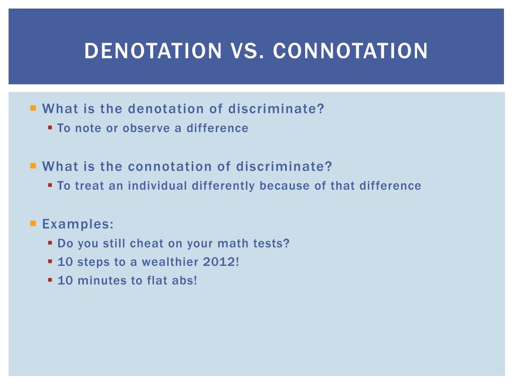 Denotation Vs. connotation • What is the denotation of discriminate? • To note or observe a difference • What is the connotation of discriminate? • To treat an individual differently because of that difference • Examples: • Do you still cheat on your math tests? • 10 steps to a wealthier 2012! • 10 minutes to flat abs!