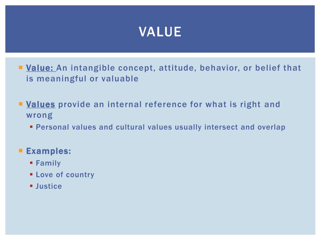 value • Value: An intangible concept, attitude, behavior, or belief that is meaningful or valuable • Values provide an internal reference for what is right and wrong • Personal values and cultural values usually intersect and overlap • Examples: • Family • Love of country • Justice