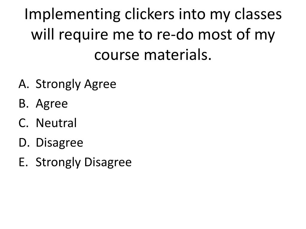 Implementing clickers into my classes will require me to re-do most of my course materials. • Strongly Agree • Agree • Neutral • Disagree • Strongly Disagree