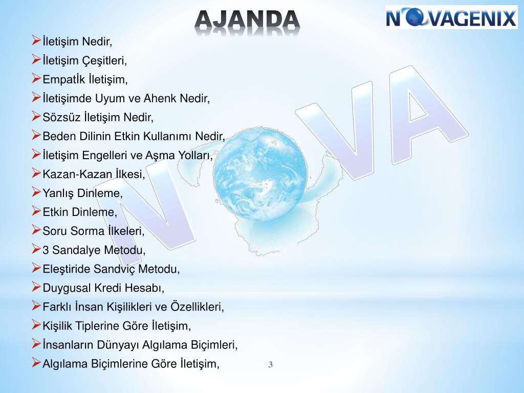 AJANDA • İletişim Nedir, • İletişim Çeşitleri, • Empatİk İletişim, • İletişimde Uyum ve Ahenk Nedir, • Sözsüz İletişim Nedir, • Beden Dilinin Etkin Kullanımı Nedir, • İletişim Engelleri ve Aşma Yolları, • Kazan-Kazan İlkesi, • Yanlış Dinleme, • Etkin Dinleme, • Soru Sorma İlkeleri, • 3 Sandalye Metodu, • Eleştiride Sandviç Metodu, • Duygusal Kredi Hesabı, • Farklı İnsan Kişilikleri ve Özellikleri, • Kişilik Tiplerine Göre İletişim, • İnsanların Dünyayı Algılama Biçimleri, • Algılama Biçimlerine Göre İletişim,
