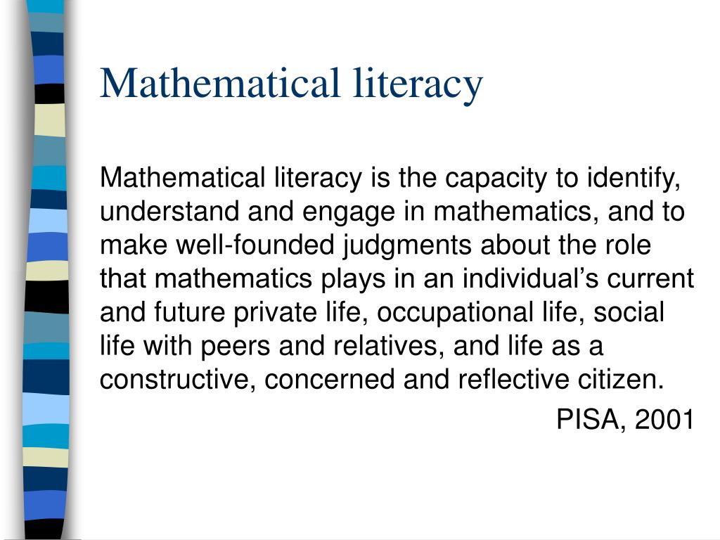 Mathematical literacy Mathematical literacy is the capacity to identify, understand and engage in mathematics, and to make well-founded judgments about the role that mathematics plays in an individual’s current and future private life, occupational life, social life with peers and relatives, and life as a constructive, concerned and reflective citizen. PISA, 2001